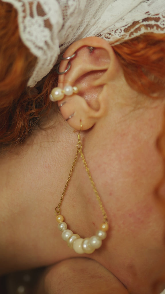 Inspiré des peaux très claires, cet earcuff met en lumière la douceur et la délicatesse des teints ivoire. Réalisé en perles de seconde main soigneusement chinées et en acier inoxydable doré. Cet earcuff est composé de perles d'acrylique.